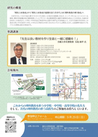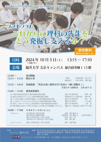 理科教員養成に関するシンポジウム兼第34回福井CST公開セミナーを開催しますのでご案内申し上げます。 記 【日時】 令和6年10月5日(土) 13:15~17:10 【会場】 福井大学 文京キャンパス 総合研究棟I 13階 【参加申込】https://forms.gle/6CktJJfvajh6wVC5A 9月29日(日)締め切り ※添付ファイルの2枚目にQRコードもございます